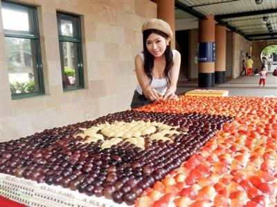 220 吋蛋糕以白色鮮奶油為底,上頭鋪上鮮紅的草莓、藍紫色的葡萄及黃白色的水梨,形成「青天白日滿地紅」的壯觀景象。