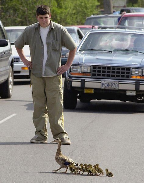 不過小鴨似乎不太領情,生怕被捉住而嚇得四處亂跑,守衞後來搬來踏板方便小鴨可以自己走上石階,但小鴨們仍是傻傻的四處張望。