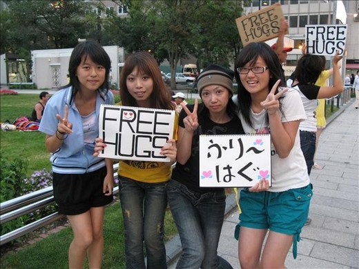 走到某處公園和新認識的姊妹們,發現旁邊就在小公園外,有一群人,各各手上拿著奇異的牌子,寫著「Free Hugs」,有沒有看錯,真的耶! 眾人百思不得其解,這到底是什麼意思? 是促銷活動? 年中慶? 廣告?