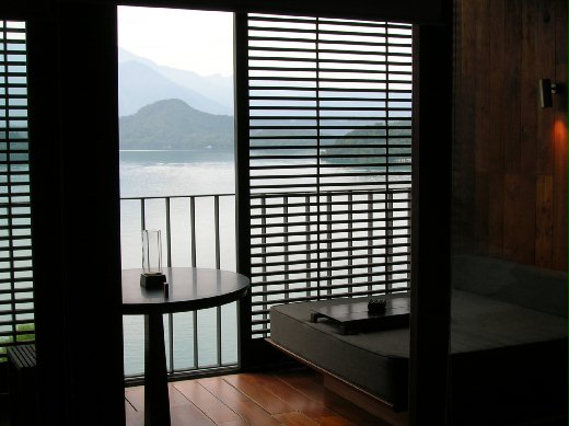 從房間遠眺濃霧瀰漫的日月潭, 貼近自然而悠閒的步調,是居住在都市叢林中難能可貴的氛圍。涵碧樓的房間,沒有很華麗的裝飾,以極簡和禪風為主要特色,主要都是木頭,營造的禪風,倚靠在陽台,向下看看那神奇的泳池,無邊際游泳池,水看似無時無刻都在向外溢出,但事實上水都在泳池內,造這個泳池,可不簡單,磁磚只要多一吋,少一吋,都會不平衡,只要差了一點點,就得敲掉從來。