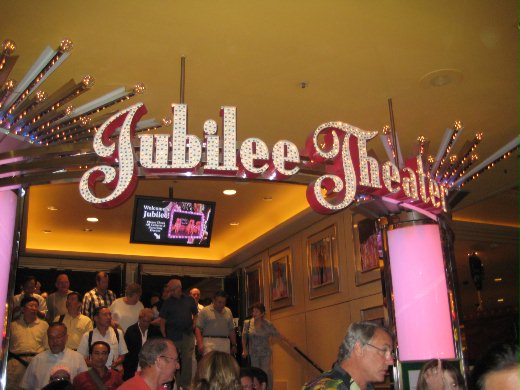 此次美西之旅趁訪親之便,還要去一生旅遊計劃中一定要去的景點 ~大峽谷(Grand Canyon). 為了滿足這一生的旅遊大願望, 必須飛到附近的拉斯維加斯(Las Vegas) 以方便行程. 到了這個以聲光娛樂聞名於世的賭城,我們不太敢輸錢的人只能去看些著名的表演以填補旅行計劃 .. 飯店的訂房服務人員極力推薦我們看" Jubilee !" 宣稱一生僅有一次, 來了賭城不看可惜. 老爸已經快80歲了,還沒看過真正的豪華大腿舞, 善體人意的 Robin 訂了視野最佳的位置招待老爸老媽, 除了娛親還可表達孝心. 當晚華麗開場, 只見穿著幾極少的美女们,如雲如風在眼前來來往往..定睛一看 ~ 才知都是上空 ! 心裡有些不好意思,竟然帶老爸老媽來拉斯維加斯看上空大腿舞. 還好各色妙齡美女除了身材姣好,舞姿亦佳, 藝術性頗高, 一點也不會讓觀賞的臉紅心跳或有非分暇想..