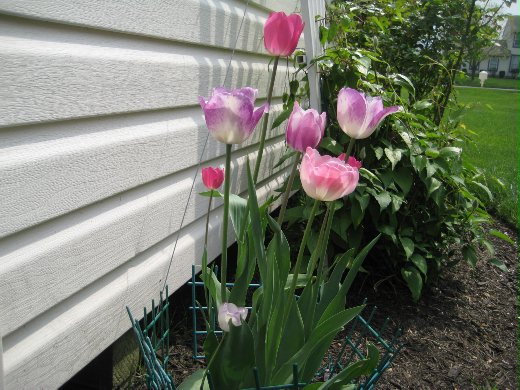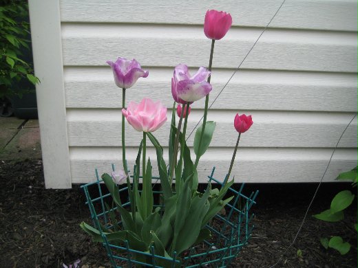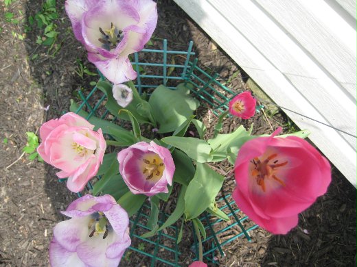 原本以為這 6 棵種在兔窩旁的鬱金香, 將無法倖存. 幾天前發現它們竟然從奄奄一息的狀況中甦醒過來, 趕緊拿一些小架子把它們圍起來以免再成為野兔的沙拉. 情況是越來越樂觀,這些鬱金香漸漸出脫得美麗異常. 所以去年秋天種的鬱金香,今年春天完全開花 ! 決定今年秋天再買荷蘭來的長莖鬱金香,它們健美,花期長又好養 !!