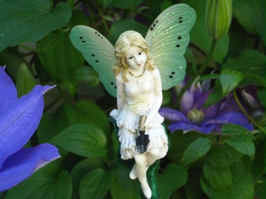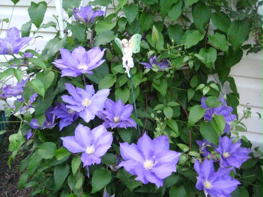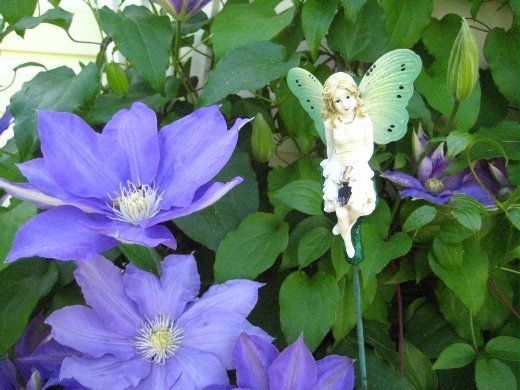 兩年前春天種的攀藤花 Clematis, 一年長得比一年茂盛. 每年春天都讓院子生色不少. 花間有個小精靈臉上有著淺笑,手裡拿著種花鏟,伴著盛開的花, 真有春天的感覺.