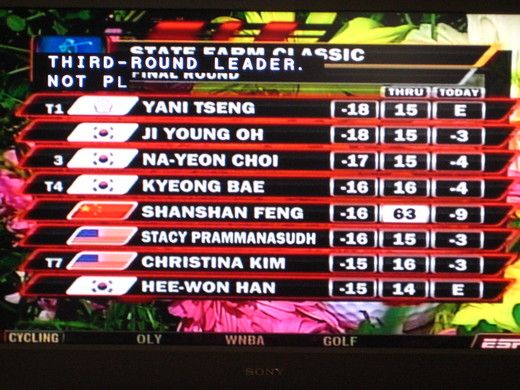 今天下午看雅妮打最後一天的女子高球公開賽,原本高興她又拿冠軍,沒想到最後一洞打了個 Bogey, 還要延長驟死賽(Sudden death). 看著雅妮把到手的冠軍拱手讓人真不是滋味. 雅妮最後一桿應該用推桿(Putting) 而不是敲桿(Chipping), 我不知她的桿弟有沒給她建議?? 還是桿弟也太年輕?? 唉, Tiger Woods 決不會用敲桿去做這最重要的一擊. 人家說 Poor putt is better than good chipp 是有道理的. 看到雅妮失掉冠軍害我也沒心情做晚餐...