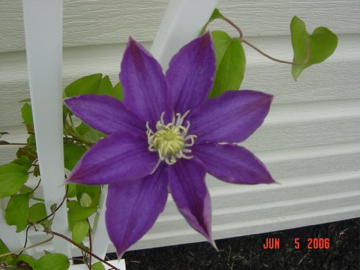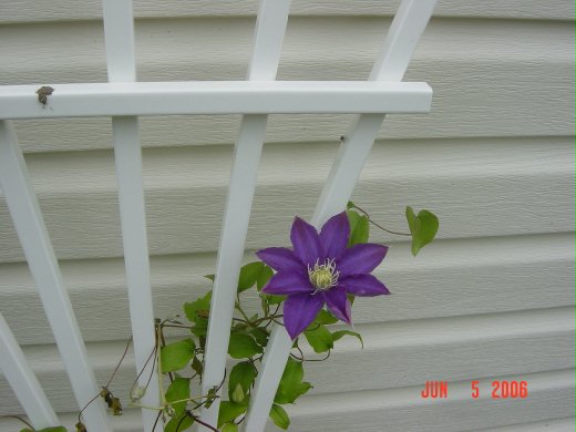 今年不死心,又種了一株類似牽牛花的花 (Clematis),沒想到一個月以來不見其生長,反而枝節漸枯..兩天前還在擔心是否又是沒緣? 沒想到今天中午看到第一朵開放的花...還是紫色的呢 ! 好高興 !!