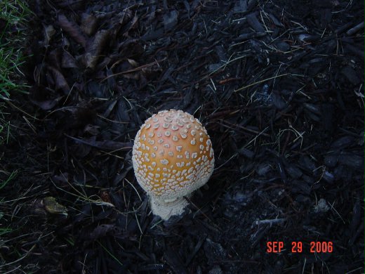 今天發現它竟然長成鮮豔的菊色,還有小小斑點. 真可愛 ! 不過, 可能有毒吧 ? 上次還想白色的菇, 應該可以吃 ? 沒想到它的真面目竟然是鮮豔的菊色..