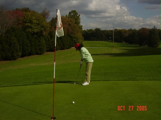 月初曾答應老公陪他打一場高爾夫,可惜因為下雨而沒有下文,給了他一張 Rain Check. 今天早晨忙著準備明後天的華盛頓賞楓之旅, 沒想到他走近身旁悄悄問我,他想去打球,有沒興趣陪他去? 看起來他沒忘記要兌現這張支票..當然我也很爽快的點頭. 掩飾不住笑容的他立即幫我去拿球具,準備午餐的三明治,還很體貼的告訴我要拿相機幫我拍打球的相片. 這樣我除了有秋景上網也可以檢討打球姿勢..