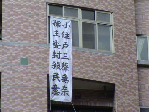 最近聽說有人在A區拉白布條,很好奇地去看一下是怎麼回事,嚇然發現幾個大字:「孫主委封殺民意、小住戶三聲無奈」。