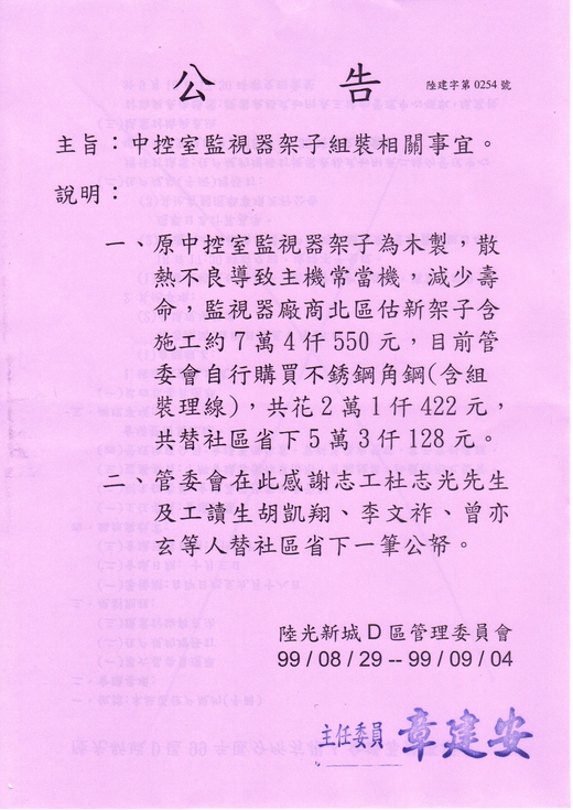 也許我們社區比較有錢,而且老伯伯也沒去特力屋比價,所以任由管委會去搞,花了比行情貴的錢,還要寫公告邀功,不知情的人還真以為他們為社區省下多少錢,建立了多大的功勞。