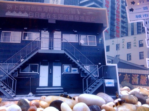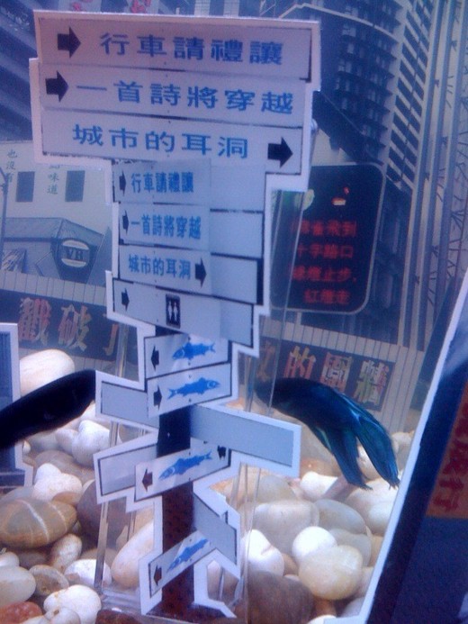 兔牙小熊(林德俊)七月底帶著大蒙設計製作的詩物件到香港最具人文氣息的書店kubrick去裝潢港式詩歌水族箱,把水族箱1號乾坤大挪移至喧鬧的廟街裡。書店一旁是電影院入口,另一旁是麥當勞,就吸睛效果而言,這位置算得上是好風好水ㄋ。P