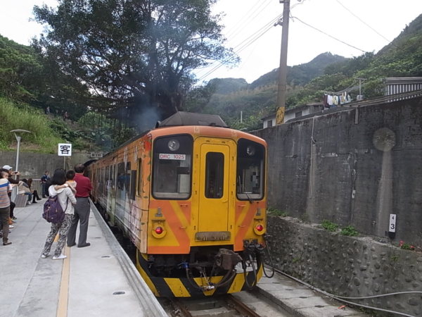 深澳火車兩點四十五分有車,搭那列到瑞芳,在月台磨蹭時間。剛進站的火車又開回深澳站月台,火車這次沒那麼多人了。