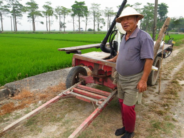 就在不遠處一位老農夫對我們招手,心想會開牛車的不就是文林伯嗎?他很開心地一直跟我們揮手。我們騎進田邊小路跟文林伯聊起天來。