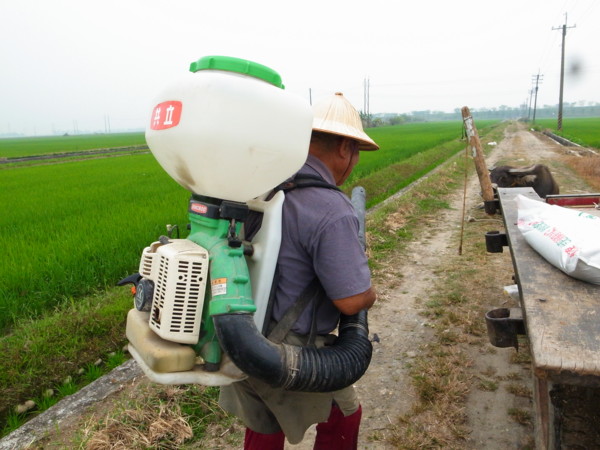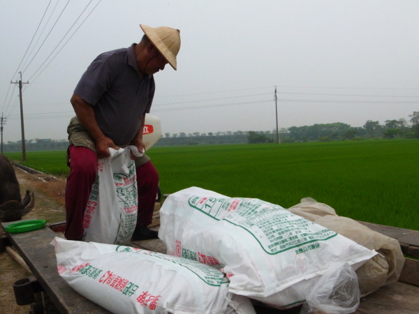 文林伯正要施肥,一包包的肥料由牛車載著。他灌進桶子中背在身上,再走進田裏面來回走。文林伯很聰明,有幾包肥料已經擺在對岸,不需走到牛車去取。
