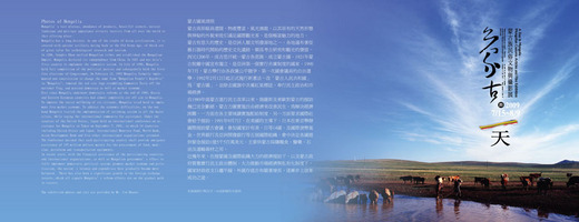 攝影作品則有蒙古特有的民俗「摔跤」、「射箭比賽」、「賽馬」、特殊的人文景觀、寺廟,如「敖包」、「甘丹寺」等。