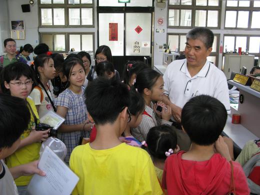 彭聖富除了為小小解說員們講解楊梅鎮的歷史外,前往工務課參觀時,還特別為他們介紹路燈的相關業務。彭聖富說,每一根路燈都像我們每個人擁有身分證一樣,擁有一個編上號碼的鐵牌,所以,如果發現路燈不亮時,可以隨時打電話給鎮公所,鎮公所會馬上派工程人員維修。
