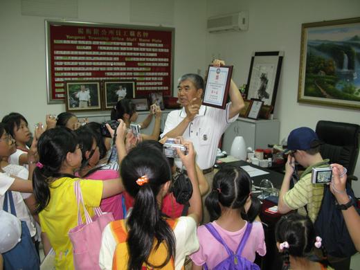 另外,彭聖富還在鎮長室招呼這群特別活躍的小學生,還高舉著楊梅鎮公所多次榮獲各項評比的「第一名」獎牌,勉勵小學生們要認真讀書,堅定目標,朝第一名的目標努力外,也鼓勵小學生們要多關心日常生活,以循序漸進的方式親身體驗探索人與環境的關係,讓我們的社會更平安更和諧。
