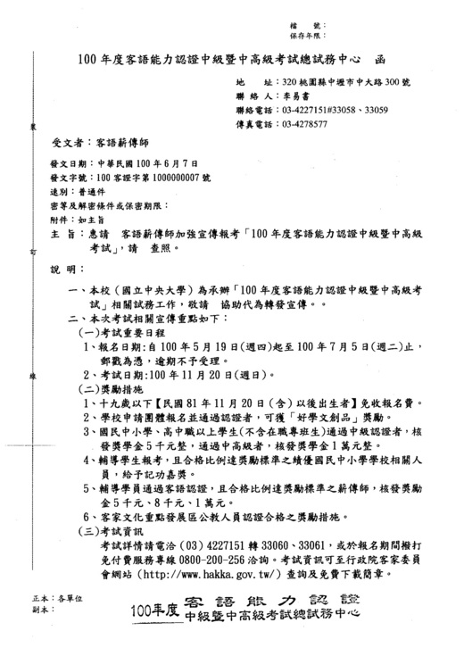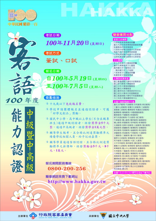 行政院客家委員會今年將辦理第4次「客語能力中級暨中高級認證」,並自5月19日起至7月5日開始販售簡章及受理報名(需掛號郵寄,郵戳為憑);訂於11月20日(週日)考試,最高可獲得1萬元獎學金,以及記功嘉獎等多項獎勵,歡迎大家趕快來報名!