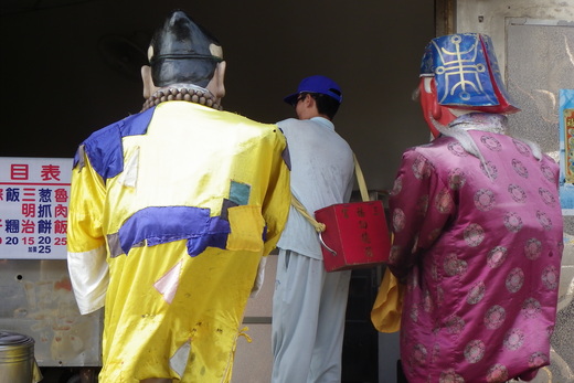 當土地公與濟公看上一家早餐店時,也許覺得餓吧,雙雙靠過去,只聽到手提著塑膠籃的導遊先生朗聲的說: