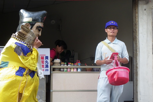然後就看到土地二老頻頻點頭,導遊先生在店門口站得筆直,店家拿出十元硬幣放進塑膠籃裡,導遊先生又帶著土地二老繼續上路。