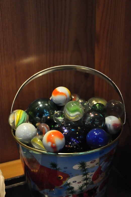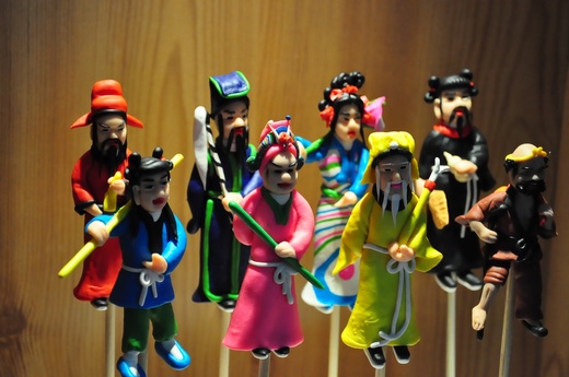 第三「境遊區」:情境布置「大稻埕」、「巷仔尾」、「廟口前」景象,展示滾鐵環、毽子、風箏、陀螺、尪仔標、套藤圈、捏麵人等。