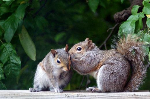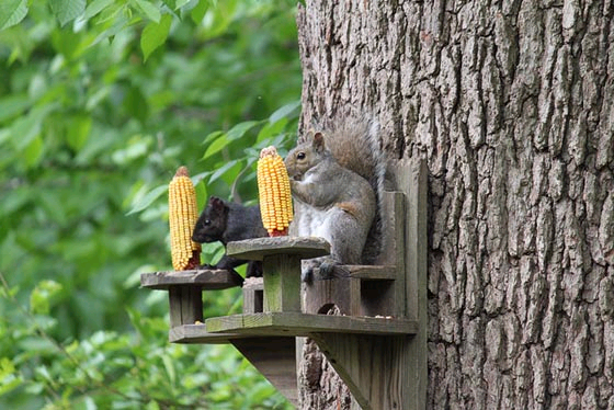 有時候人類會主動餵食,或將食物放在上頭,吸引牠們過來飽餐一頓。這兩隻一黑一灰的松鼠就坐在上頭,一邊大啖玉米的美味,還能一邊眺望遠方的景色。
