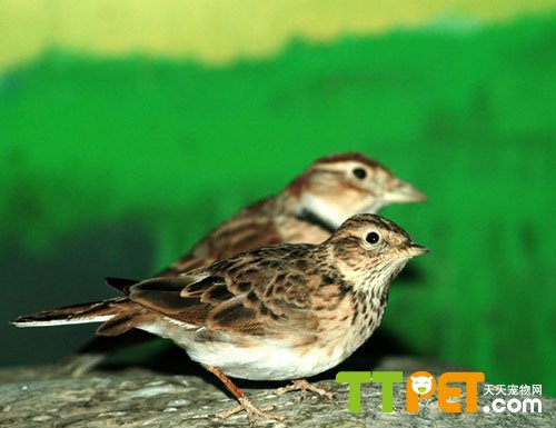 雌雄百靈鳥的區別:百靈鳥雌性的體色和雄性的幾乎一樣,但是,雌鳥額頭和頸部的栗紅色毛髮比雄鳥的少,身體上的羽毛也偏近於淡淡的褐色,而胸前的那兩條黑斑條紋沒有雄百靈鳥那麼明顯。嘴部的顏色為土黃色,足部腳趾是肉粉色的,它的爪子和一般鳥類不同,尤其是後爪,要比普通鳥類的後爪大一些,而且還徑直的伸向後方。爪部的顏色為褐色。