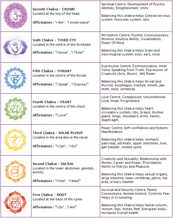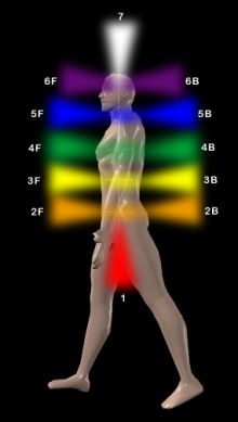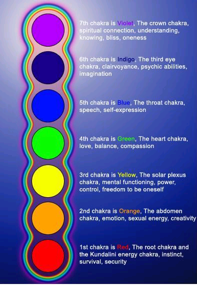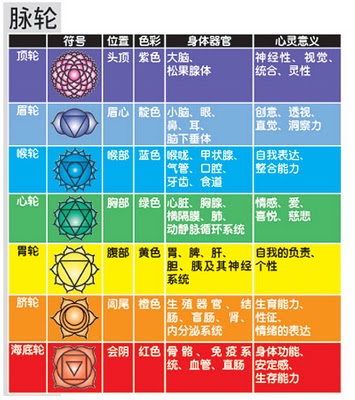 脈輪是指分佈在人體中的七個能量中樞,分別為頭頂、眉間、喉頭、胸口中央、肚臍附近、下腹部和尾骨。人們認為,脈輪的作用就是對身體各個器官的機能、感情、精神施加影響,並且和色彩有密切的聯繫。從下而上分別為紅橙黃綠藍靛紫。