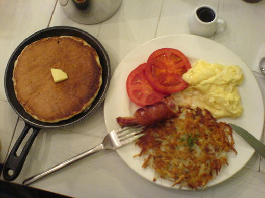 內容有帶骨德式香腸、美式炒蛋、薯餅、番茄以及煎鍋蛋糕(就是鬆餅啦!!)