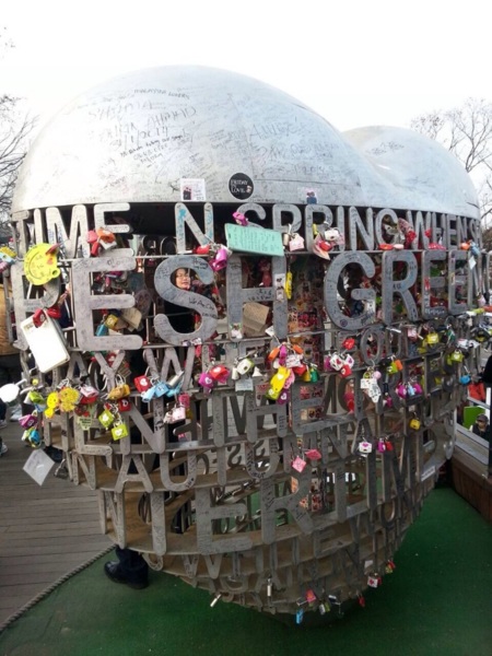 下一站要去的是前些日子迷的女子團團轉的(來自星星的你”歐爸”都敏俊的拍攝地~尖叫聲),在山角下往下看還滿高的,我只能說我們太幸運了好在是搭攬車上山,因為這山也太陡了吧,大多觀光客好像都是用爬山上塔的,不然我們這些都很少在運動的人鐵定會GG,沿途欣賞早晨的美景,終於來目賭了愛情鑰牆的地方,如果這次有另外一伴來的話鐵定馬上去買個鑰匙勞勞給他鑰上,還有這裡有象徵韓國的守護神獬豸Q版的超可愛,在韓國處處可見。