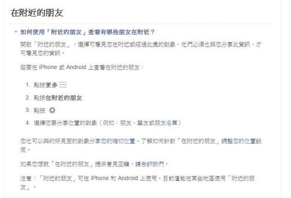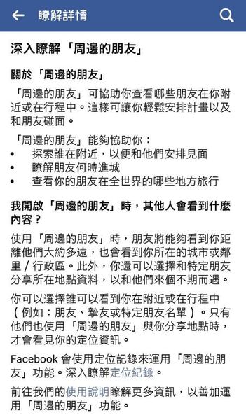 ↑Facebook對於「在附近的朋友」的中文使用說明