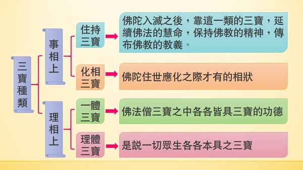 (2)法的本體,具有能生諸佛之性,所以是佛寶;法的本身,就有軌持的功能,所以是法寶;法法平等,互不相妨,所以是僧寶。