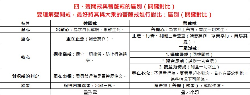 | 四、聲聞戒與菩薩戒的四、聲聞戒與菩薩戒的區別(關鍵對比) 要理解聲聞戒,最好將其與大乘的菩薩戒進行對比:區別(關鍵對比) | ||