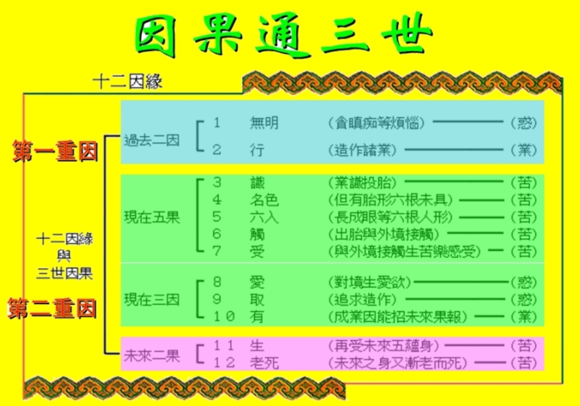 佛教所談三世因果之相,要詣大概不過於此,十二因緣觀對此作了詳細的描述。然而如是而論雖足知因果之關係,若問此惑、業、苦三法從何生來,則以阿賴耶緣起而詮釋之。故於業感緣起之次,有阿賴耶緣起。