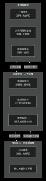 「宗教實踐」是宗教信徒為實現其信仰目標,而進行的系統性、重複性且有意義的活動與修持。它不僅是外在行為,更是整合了信念、體驗、倫理與社群生活的完整生命歷程,其核心目的是實現生命的轉化與超越。 理解「宗教...