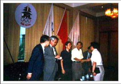 1993年謝長廷、“考試院長”姚嘉文、民進黨“立委”蔡同榮等人前往大陸訪問,在北京機場貴賓室內與五星國旗下合影的照片