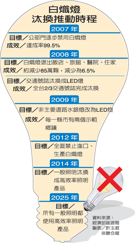 今年三月經濟部能源局已公告「白熾燈能源效率標準」,將於二○一二年實施,不符標準的白熾燈將無法進口及生產。此外,從明年起,重點公共場所除極少數的特定用途外,將全面禁用白熾燈與冷氣溫度限制等相關規定。