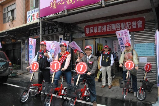剛從環保局長卸任的桃園縣立委補選候選人陳麗玲,今(28)日成立「環保單車掃街團」,並且邀請形象清新、推動環境保護一樣不遺餘力的環保署長沈世宏、立法委員周守訓到埔心競選服務處進行「試騎」,新任桃園縣環保局長陳世偉也趕來現場加油打氣。