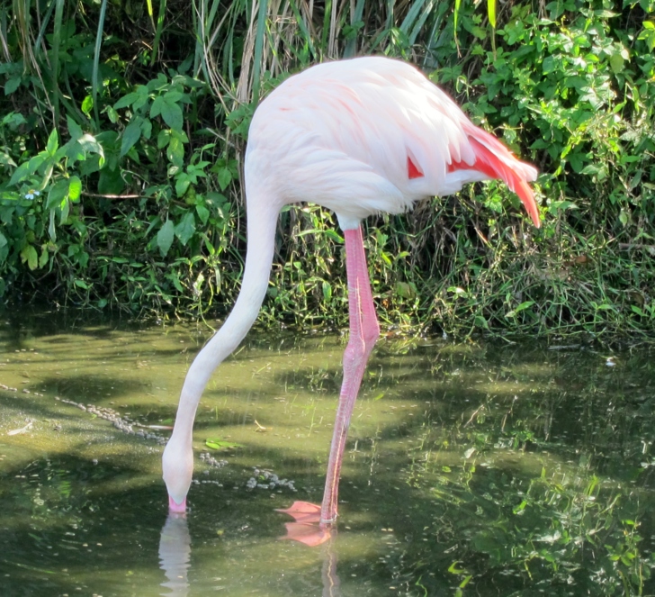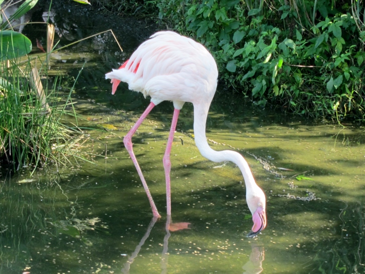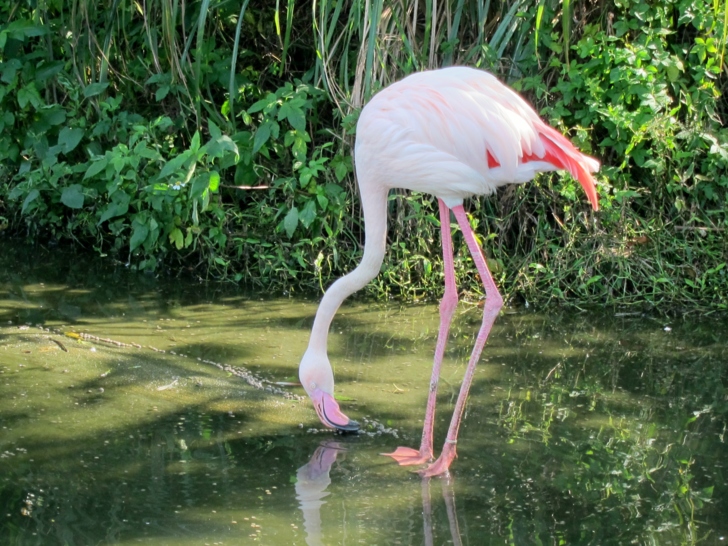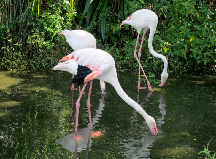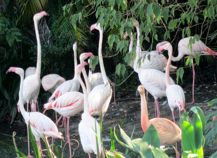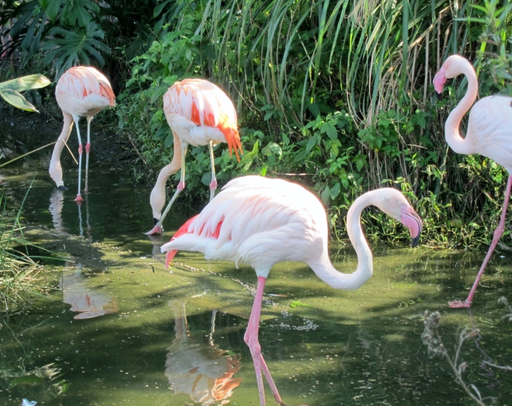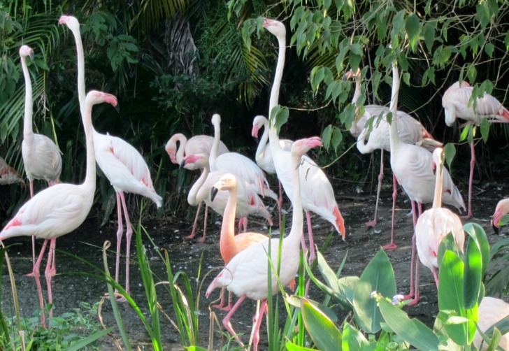 這些火鶴被圈養在一個人造的水岸,但是卻不是籠子,它沒有頂篷,也沒有網,是一個完全開放的空間,看起來如同是一般火鶴的正常生活環境,而不是被養在動物園的展示動物........