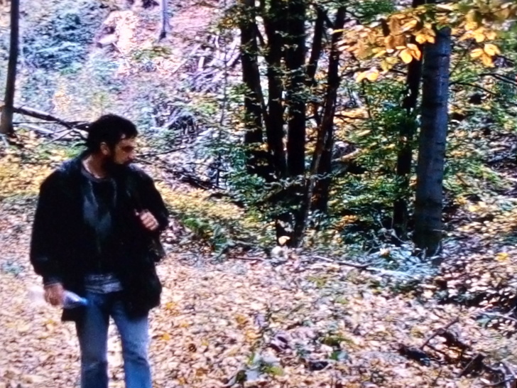 他手中握了一個空的水瓶 在林子中到處找尋水源........