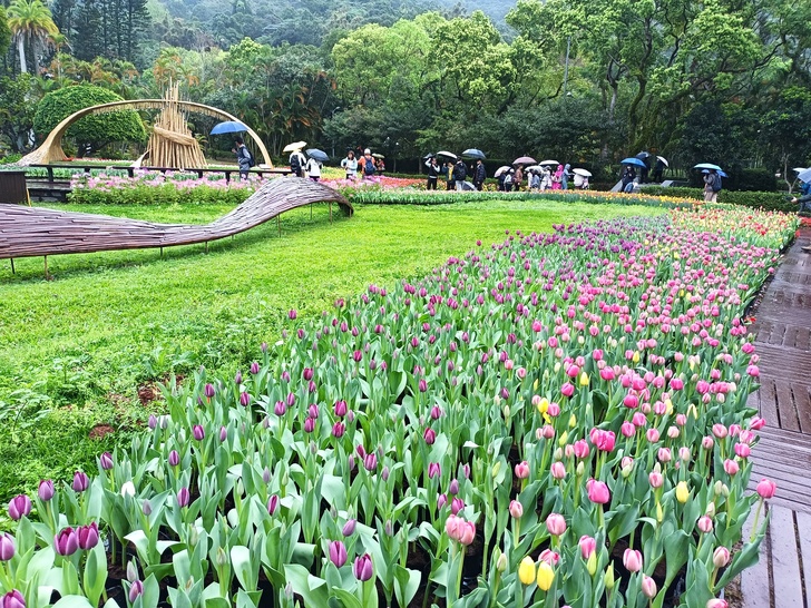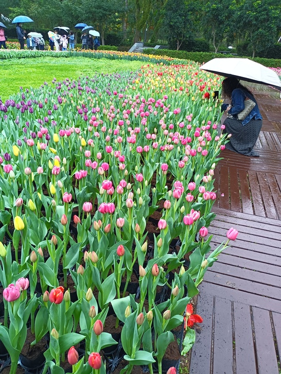 賞花的遊人稀稀落落的 大家都得撐著雨傘拍照