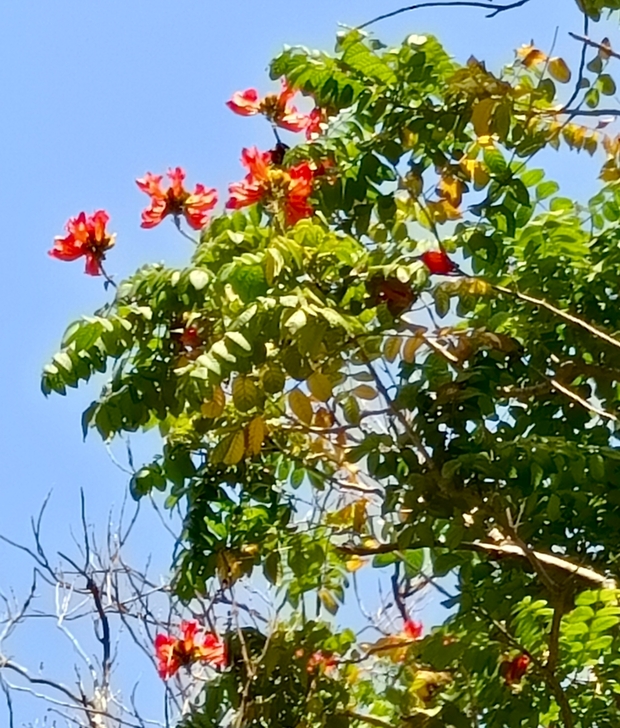 然而火焰木 有木棉樹所沒有的 綠意盎然的葉子簇擁著