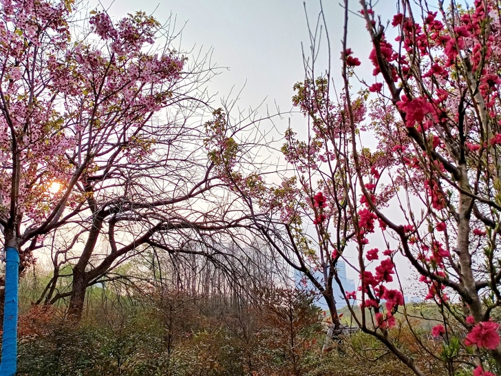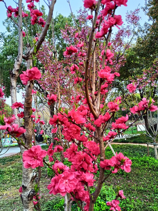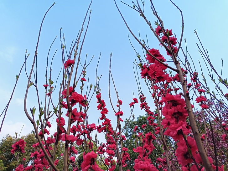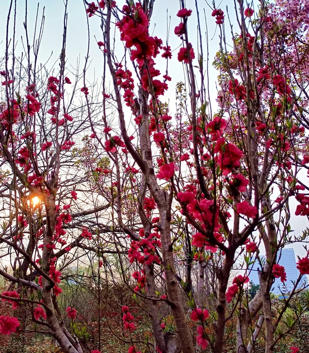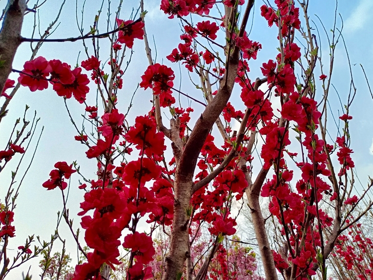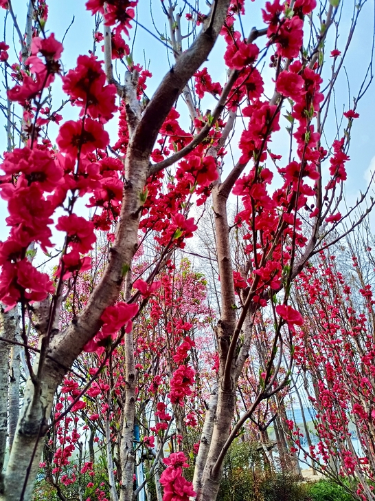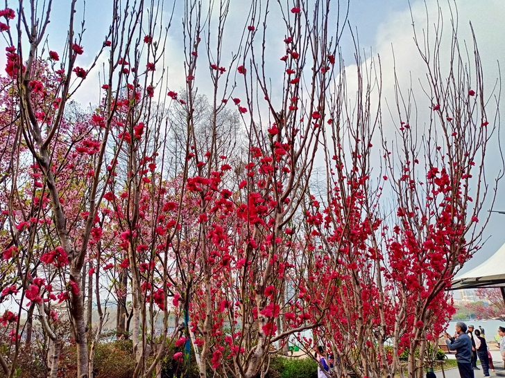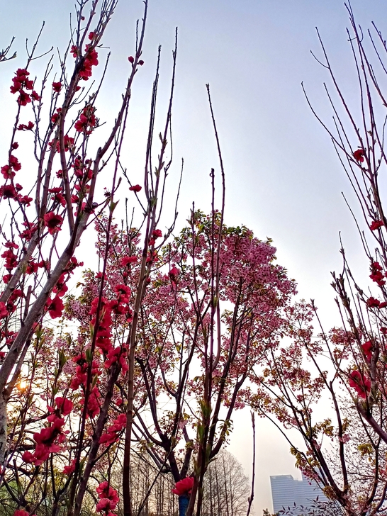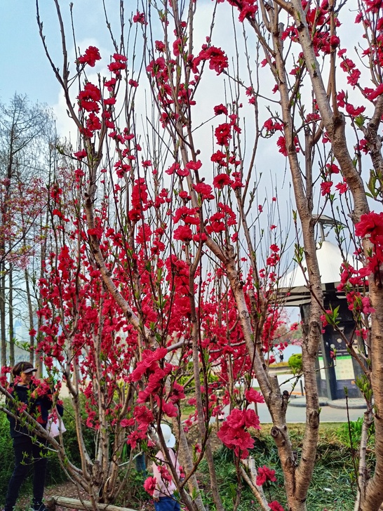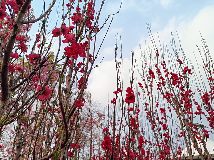右前方艷麗的紅花 是桃花 左前方是櫻花......