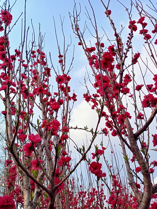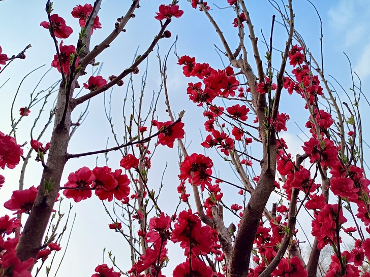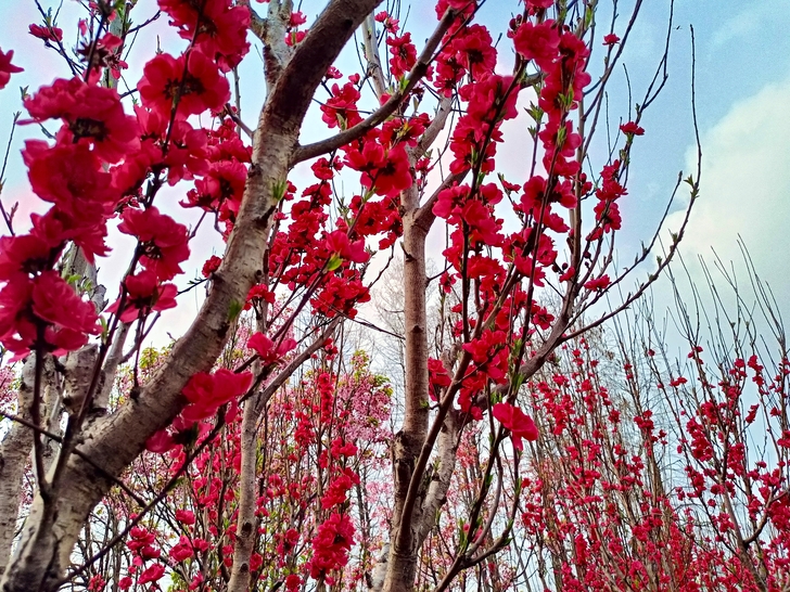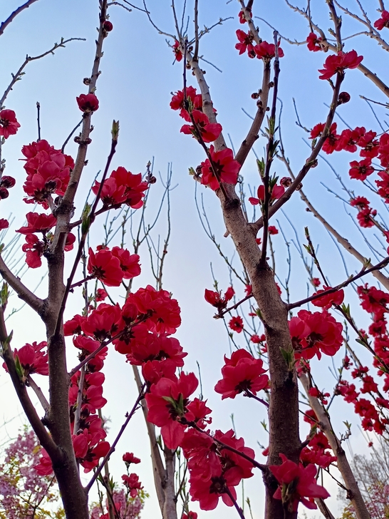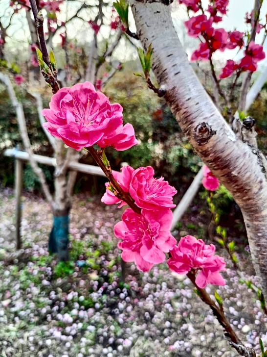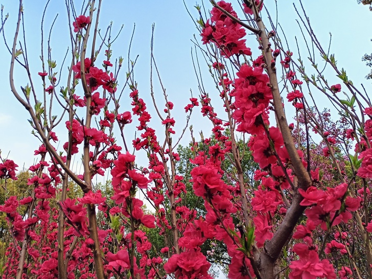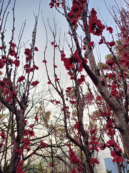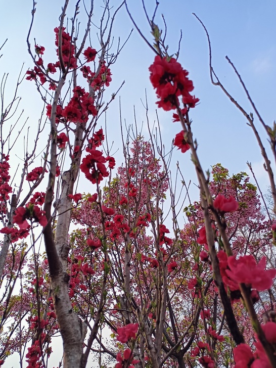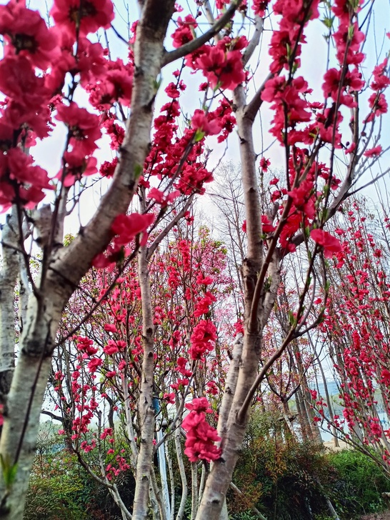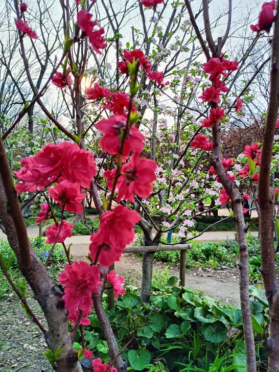 右前方艷麗的紅花 是桃花 左前方是櫻花......