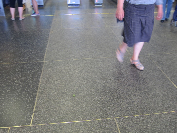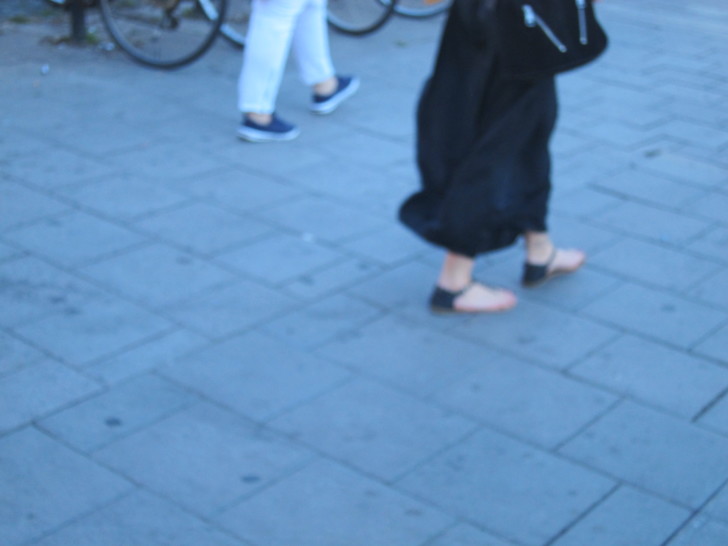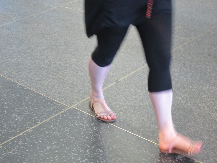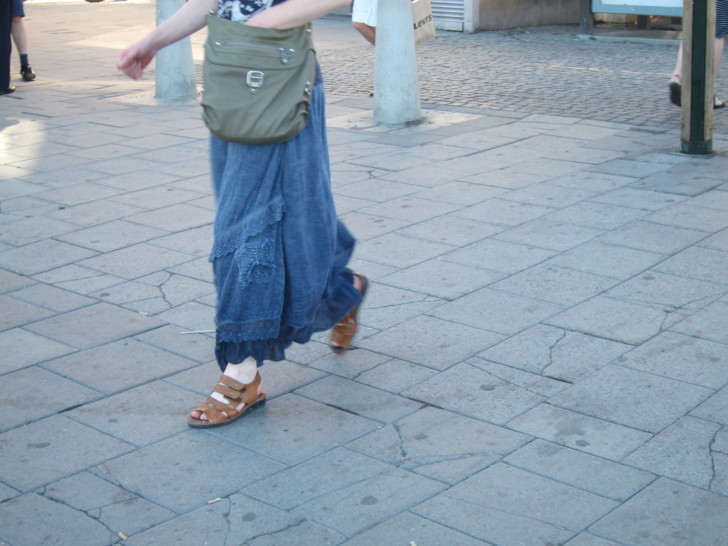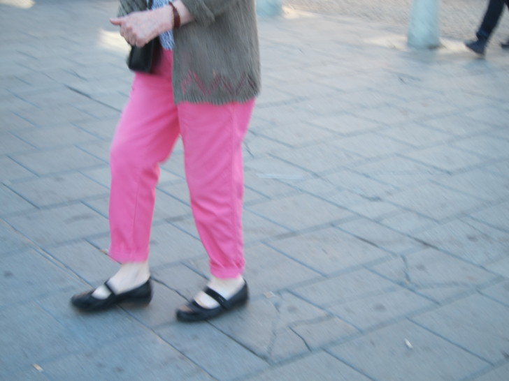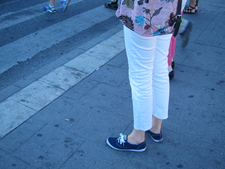 這應該是個中年婦女,藍色的帆布鞋,沒穿襪子,露出腳踝的長褲,還是很潮的......