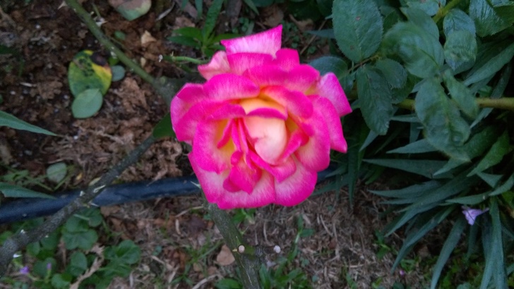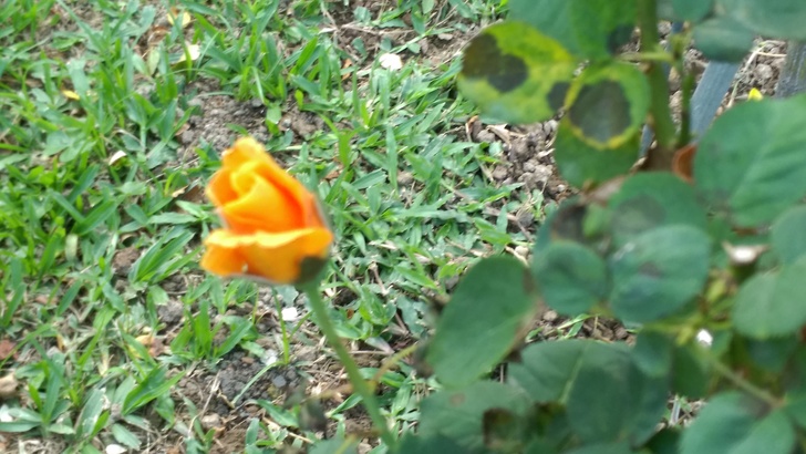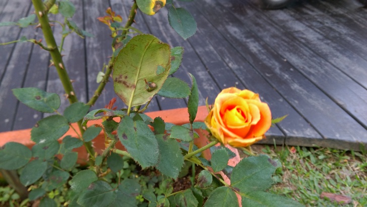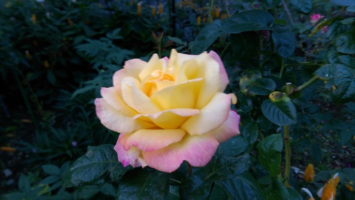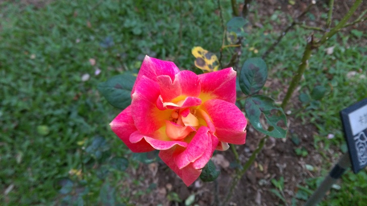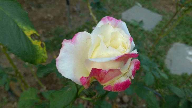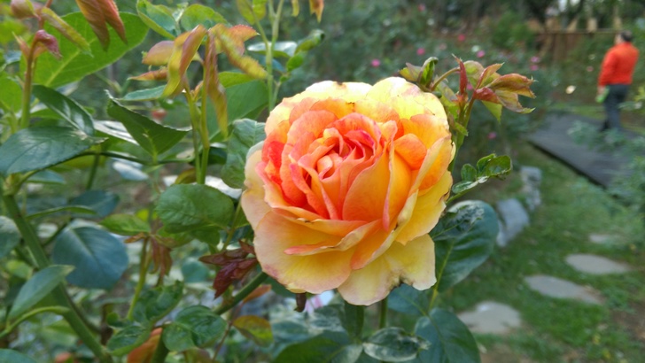 是屬於現代雜交茶香玫瑰,黃色底 橘紅沁邊