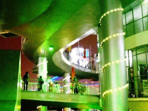荷蘭館坐落在熱門館雲集的C片區,她的設計很特別,從空中看,是一個8字形的建築群;她的展廳有二十間,都是懸掛密閉式的,遊人只能在露天的街上參觀,就像逛街那樣而她的設計主題正好是 Happy Street;在人潮擁擠的夏夜,能這樣高高在上的閒逛,吹著涼風,真是何等愜意啊,.....