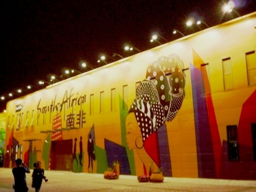 在南非世界盃足球賽開打之前,南非國家館前,總是長龍大排,因為大陸人普遍都很熱愛足球,這現象自然理所當然,雖然他們的足球有職業聯賽,也造就不少大牌球星,不過球隊的水準,即便在亞洲也只能算二流的球隊,連踢世界盃的入場券都拿不到,……但並不影響球迷嚮往、迷戀足球的熱情!所以南非館,會吸引人潮,是很自然的事。那天我去參觀時,是在五月的一個晚上,世界盃尚未開打,南非館在夜幕中,它的外牆畫了充滿濃郁的非洲色彩的圖象,在燈光下,前總統曼德拉的畫象與名言,有如閃爍在非洲大地的懷抱中;進場後,只見到處都是足球元素,中央有個木柵欄,象徵南非傳統的“柵欄村莊”,也象徵南非“人道待人”的文化核心理念;它的外圍環繞一個超大超高的360度屏幕,於世界杯期間作現場轉播,所以在四周,擺了各式的大藤椅,供參觀的球迷坐下來,可舒適的看球關心比賽;在館中還可看到“我們準備好了”之類的圖片,.....