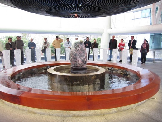 參觀者圍著這顆石頭祈福,在螢幕上選擇想要的字句,觸摸視屏..
