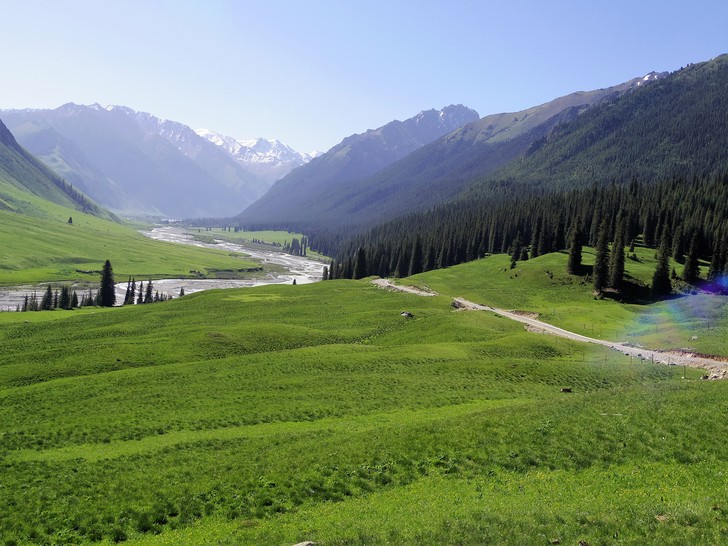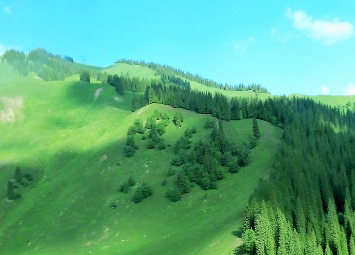 我一直都喜歡新疆, 有人若需要靠環境來靜心, 新疆是第一首選~ 妳看, 那綠色草原和石壁, 像是上漆的顏色呢!