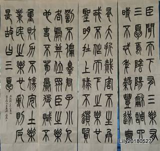 臨吳讓之的〈三樂三憂帖〉時,刻意將字體放大,12*15公分,寫大字是目前所欠缺,因此有意練大字,以友生昌的「得心應手」筆寫,剛開始第一聯真的很生疏,用慣了蕙風堂的「大如意」,換成「得心應手」,真的不好掌控,不過寫到第二聯第三聯,就熟悉多了。
